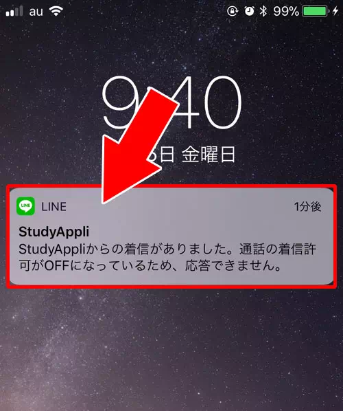 『通話の着信許可』設定を『オフ』にした状態でLINE電話の着信があると以下のような通知が送られてきます。