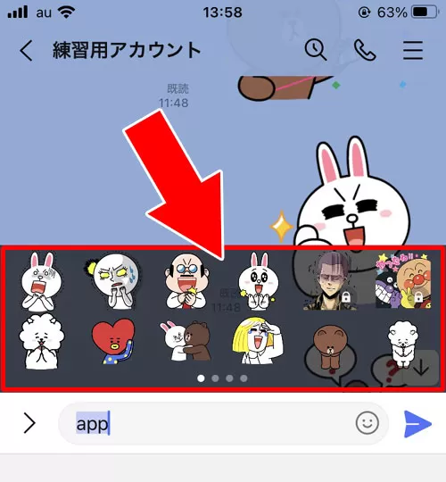 スタンプのサジェスト設定がオンの状態でトークメッセージを入力すると以下のようにスタンプが表示されます。