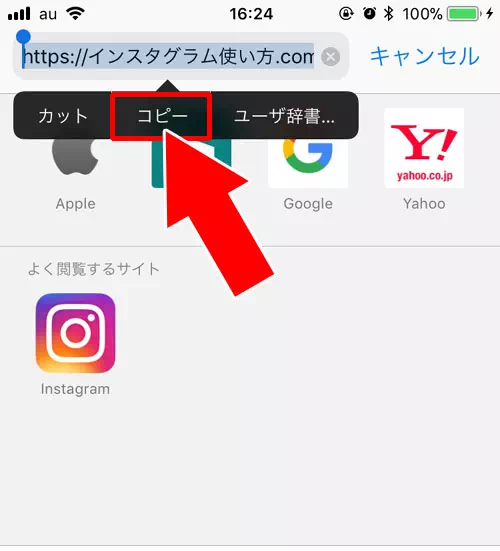 - urlの入力画面に切り替わるので現在入力されている『アドレスバー』を長押し