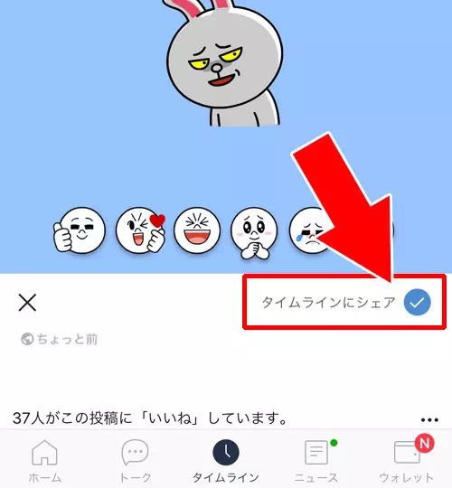 - いいねのスタンプを選択する前に『タイムラインにシェア』をタップしてチェックを外す